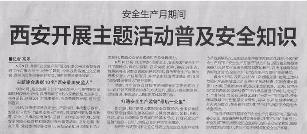 (一)6月11日《西安日報》A10版、6月10日《西安晚報》A2版均報道了安全生產(chǎn)月期間西安開展主題活動普及安全知識相關內(nèi)容。